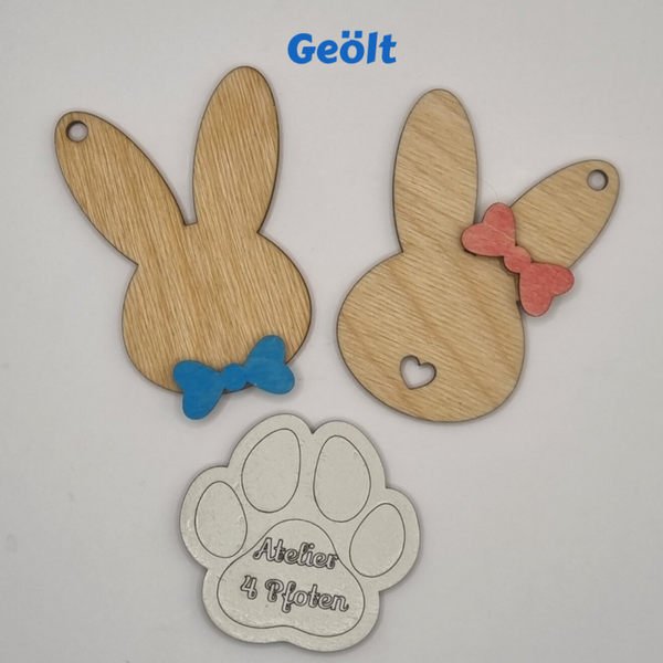 Die Schleife für den Hasen mit Herz und die Fliege werden nach Farbwunsch mit Acrylfarbe per Hand bemalt, die verfügbaren Farben findest du auf dem letzten Bild.
