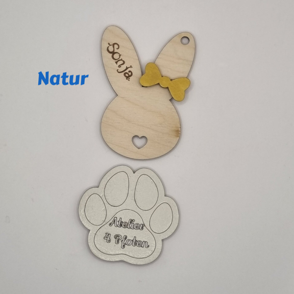 Ein Name kann pro Hase auf das freie Ohr graviert werden um ihn noch persönlicher zu machen.