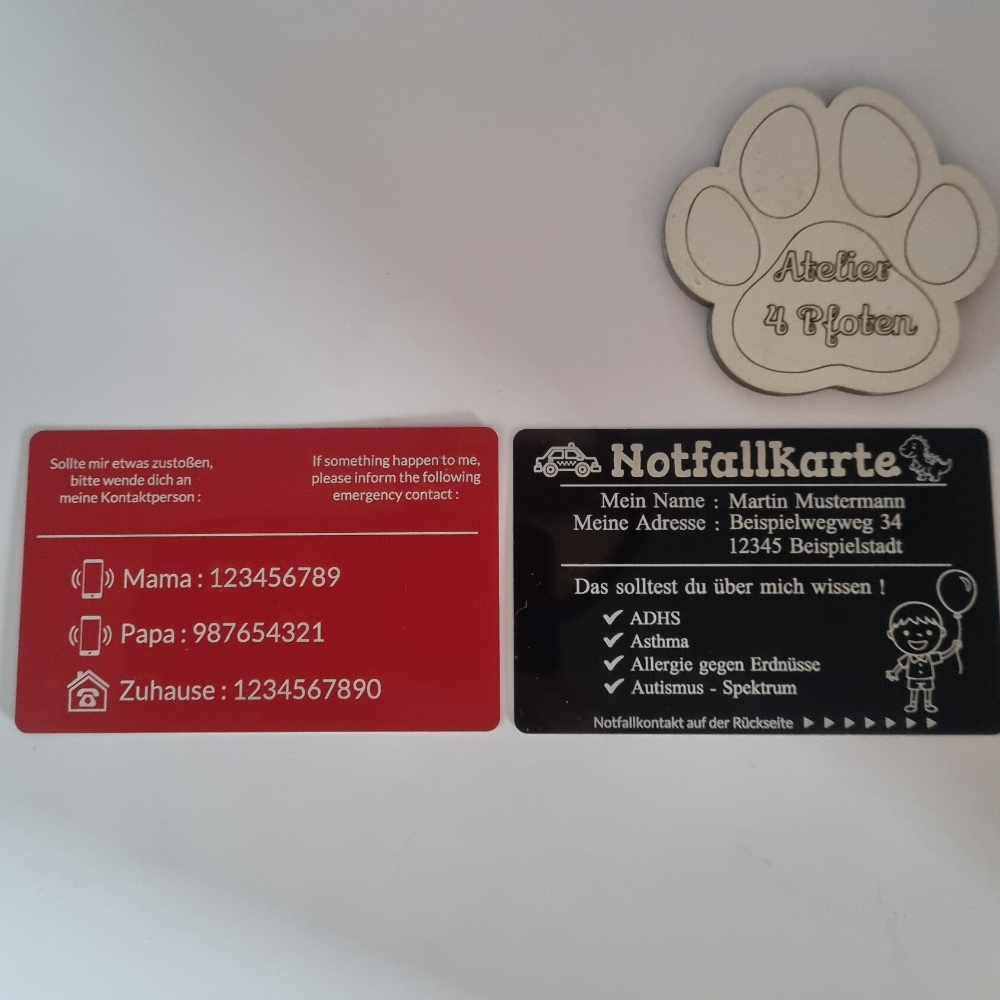 Ob auf dem Schulweg, im Kindergarten oder beim Ausflug – mit dieser handlichen Notfallkarte ist dein Kind im Ernstfall gut abgesichert. Die personalisierte Karte enthält Name, Adresse und bis zu drei Telefonnummern für den Notfall (z. B. Mama, Papa, Haustelefon).