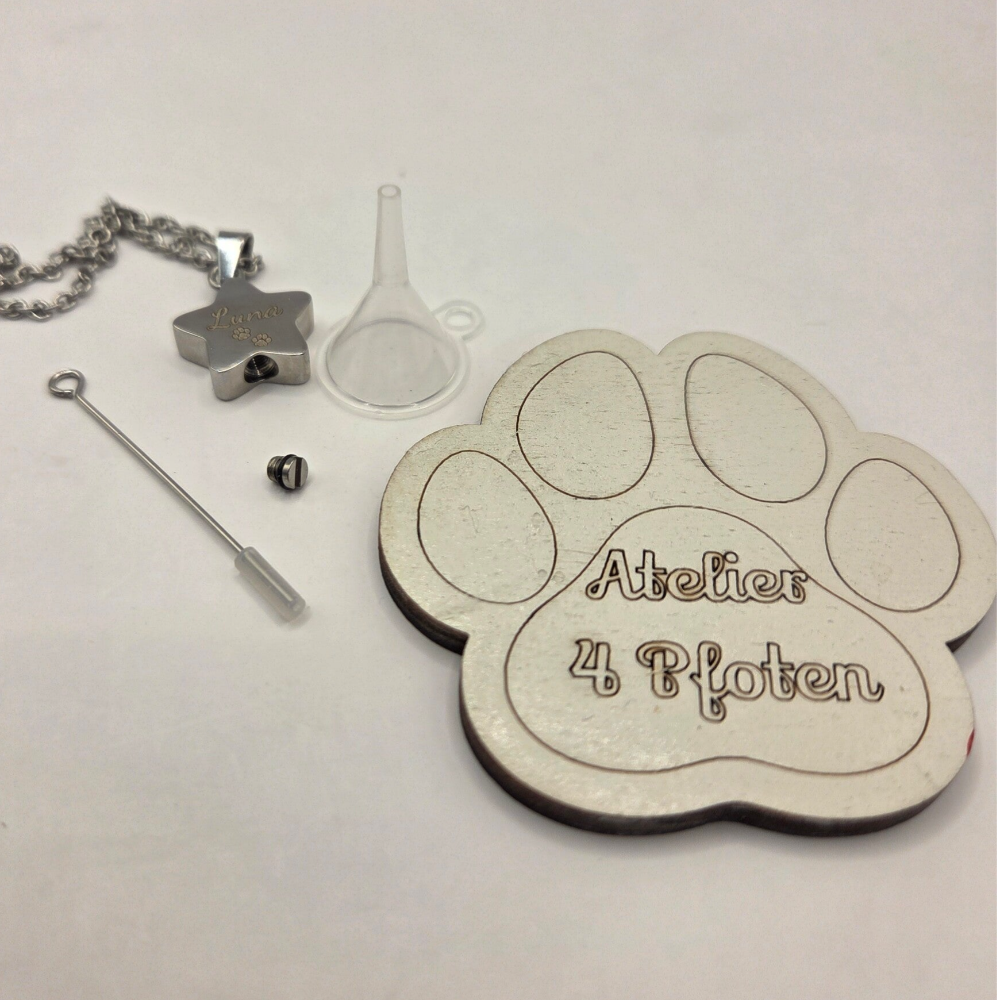 Der Anhänger und die Kette bestehen aus hochwertigem Edelstahl. Auf der Vorderseite wird standardmäßig der Name deiner Fellnase zusammen mit zwei kleinen Pfoten graviert – ein zartes Symbol für Liebe und Verbundenheit. Die Rückseite kann wahlweise ebenfalls mit dieser Gravur versehen oder individuell gestaltet werden – etwa mit einem Geburts- und Sterbedatum oder einem kurzen, persönlichen Text.