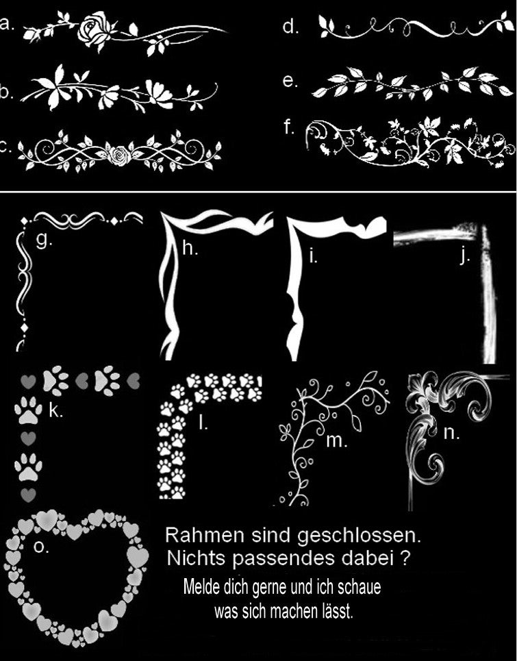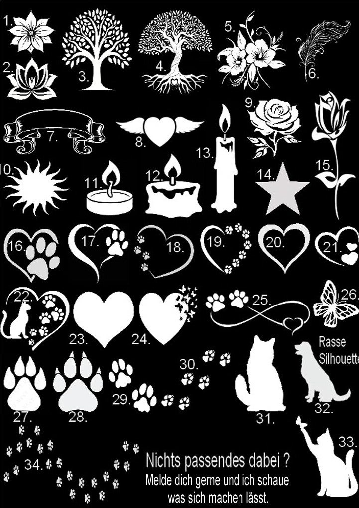 Hier kannst du deinen Wunschtext eingeben wenn du einen möchtest. Denke bitte an Rechtschreibung und Satzzeichen. ( Name / Daten / Sprüche )
