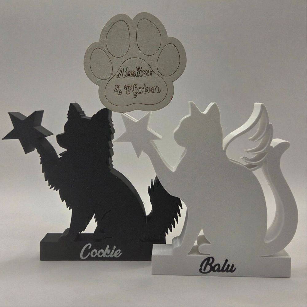 Diese besondere Tier-Silhouette zeigt dein Lieblingstier in sitzender Position mit der Pfote nach oben – als würde es nach einem Stern greifen. Optional kann der Stern im Detailfeld gegen ein anderes Symbol ersetzt werden, sofern es möglich ist. Du kannst außerdem filigrane Flügel hinzufügen lassen, die direkt mitgedruckt werden und dem Aufsteller eine zarte, besondere Note verleihen.