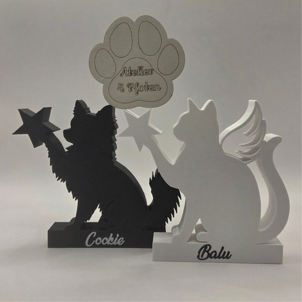 Diese besondere Tier-Silhouette zeigt dein Lieblingstier in sitzender Position mit der Pfote nach oben – als würde es nach einem Stern greifen. Optional kann der Stern im Detailfeld gegen ein anderes Symbol ersetzt werden, sofern es möglich ist. Du kannst außerdem filigrane Flügel hinzufügen lassen, die direkt mitgedruckt werden und dem Aufsteller eine zarte, besondere Note verleihen.